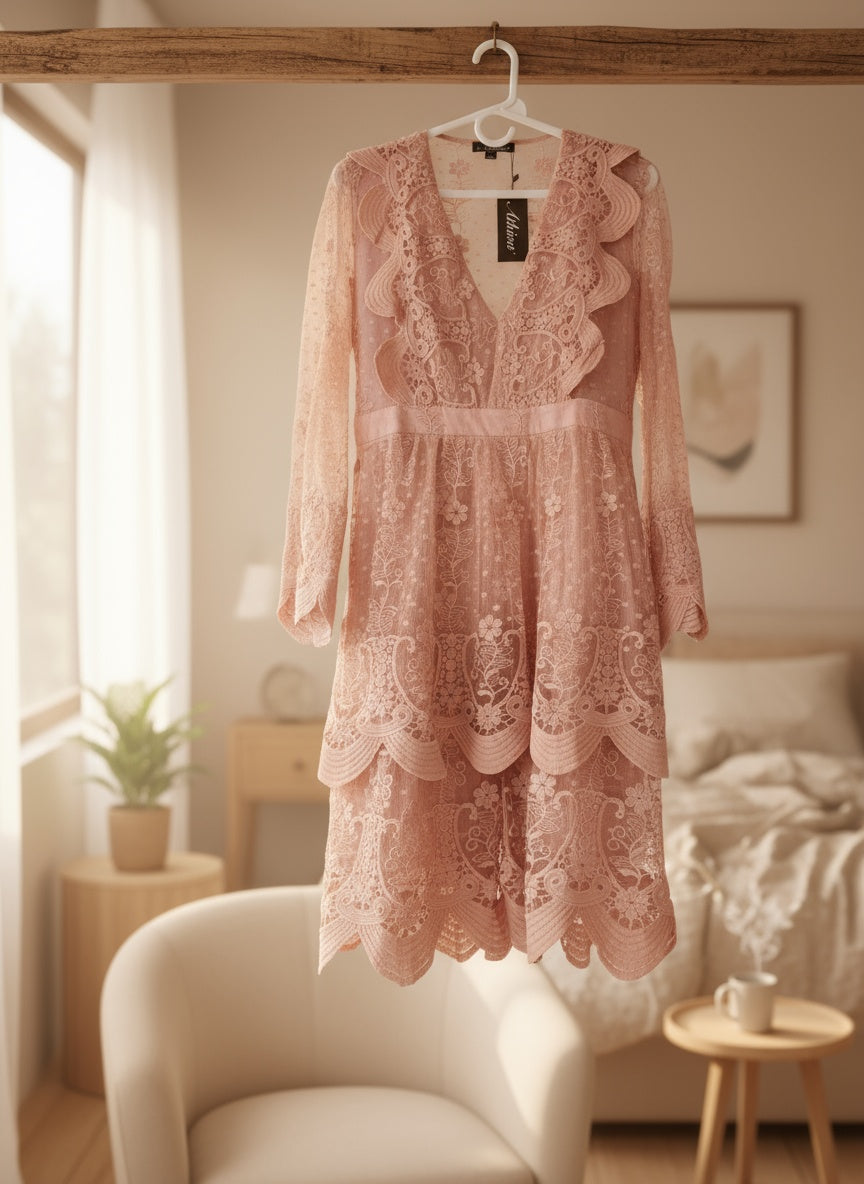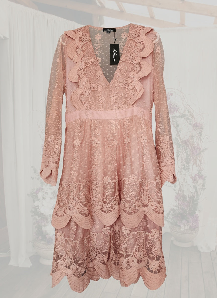 Indulge yourself in the luxurious beauty of this dress, which boasts a partially lined design, semi-sheer lace sleeves and back, a tiered skirt, and a concealed side zipper closure. Experience the effortless elegance and charm that this dress exudes.