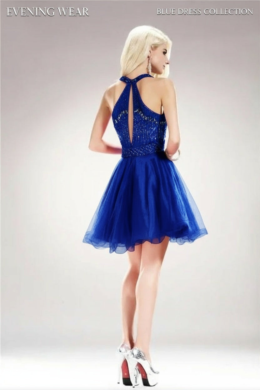 Featuring a sleeveless design and a semi-open back, this luxurious Halter Top Cocktail Mini Dress is adorned with stunning sequin and crystal beading embellishments.