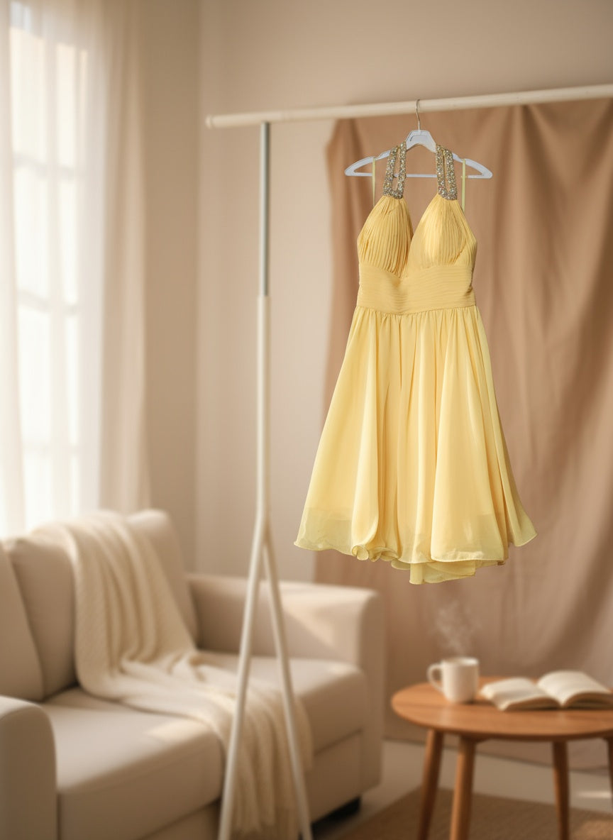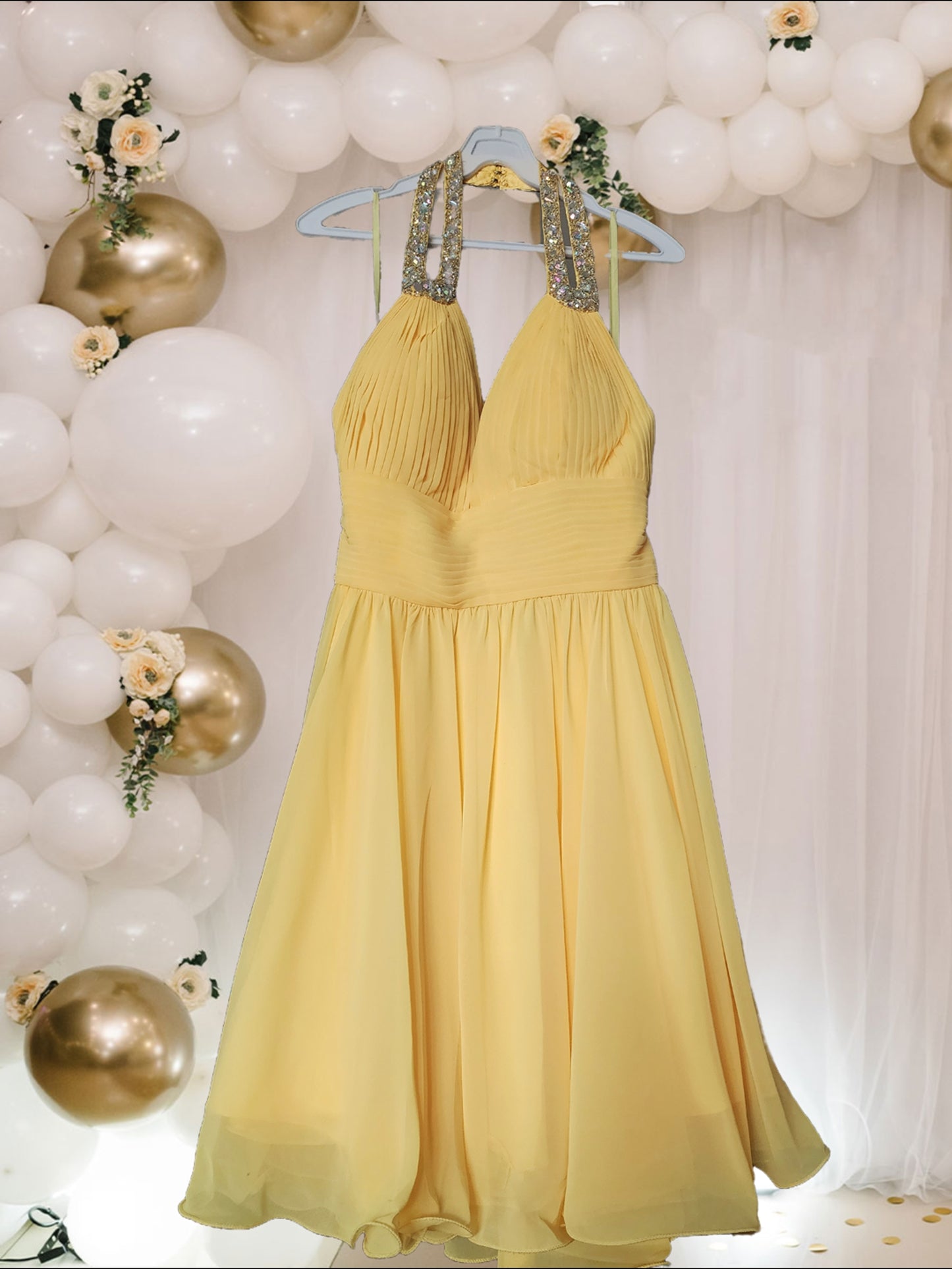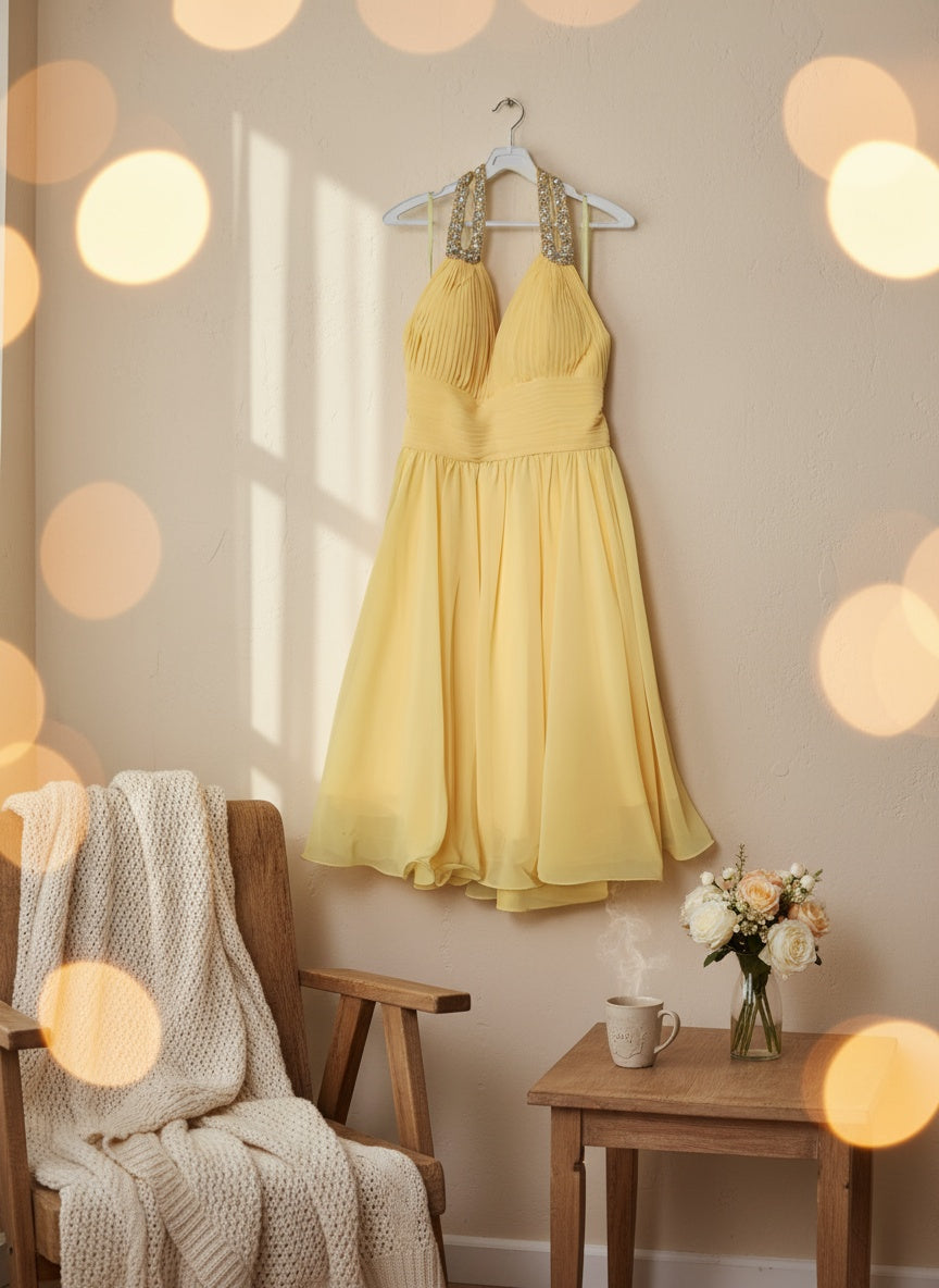 Indulge in the elegance of this halter top dress, adorned with sparkling rhinestones along the V neckline. Its fit and flare design, with added ruffles on the bottom, offers luxurious volume while the chiffon material ensures a lightweight and refined wear. Opt for a classic one-tone look with this solid-colored piece, featuring a short open back.