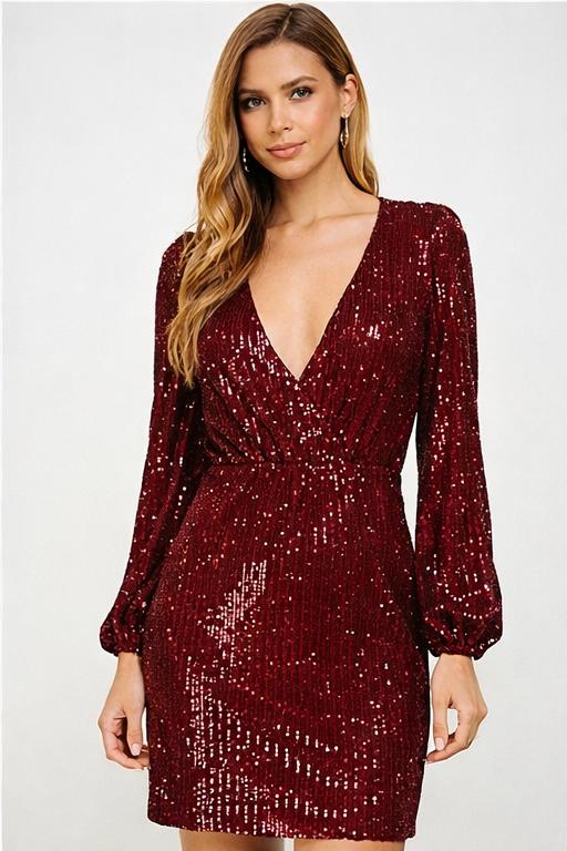 The flattering V-neckline enhances the silhouette while the softly gathered waist creates subtle definition without compromising comfort. Long, billowy sleeves balance the look with a touch of sophistication, while the mini length keeps it modern, flirty, and effortlessly chic. Fully embellished with light-catching sequins, this dress delivers a radiant glow under any lighting—whether it’s candlelit dinners or a glamorous party setting.